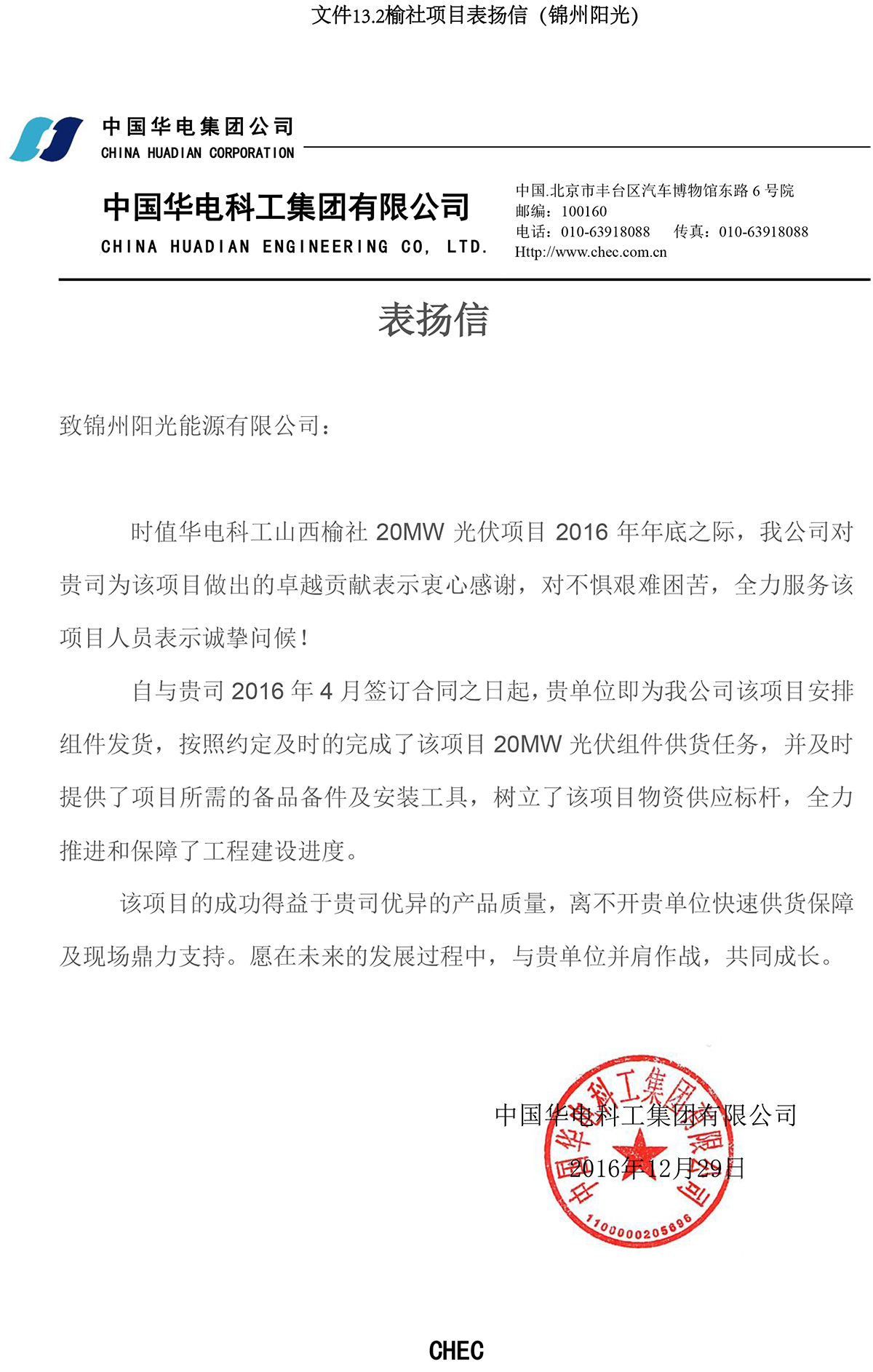 濟源項目からの感謝狀(錦州ソーラーギガ)