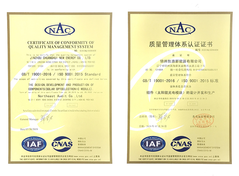 2019年7月30日,錦州陽光能源有限公司全資子公司錦州創(chuàng)惠新能源有限公司喜獲品質體系認證證書