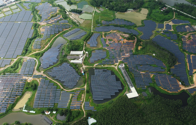 值得一提的是,廣東省開平市150MW光伏項目綜合采用了“農(nóng)光互補(bǔ)+漁光互補(bǔ)”新型發(fā)電模式——板上光伏發(fā)電,板下土地進(jìn)行農(nóng)業(yè)種植、板下水域進(jìn)行漁業(yè)養(yǎng)殖——滿足周邊用電需求的同時,還實現(xiàn)了電力與農(nóng)業(yè)、漁業(yè)的有機(jī)結(jié)合,實現(xiàn)三重經(jīng)濟(jì)收益。從高空俯瞰,耕地、漁田與陽光組件交相輝映,波瀾壯闊。